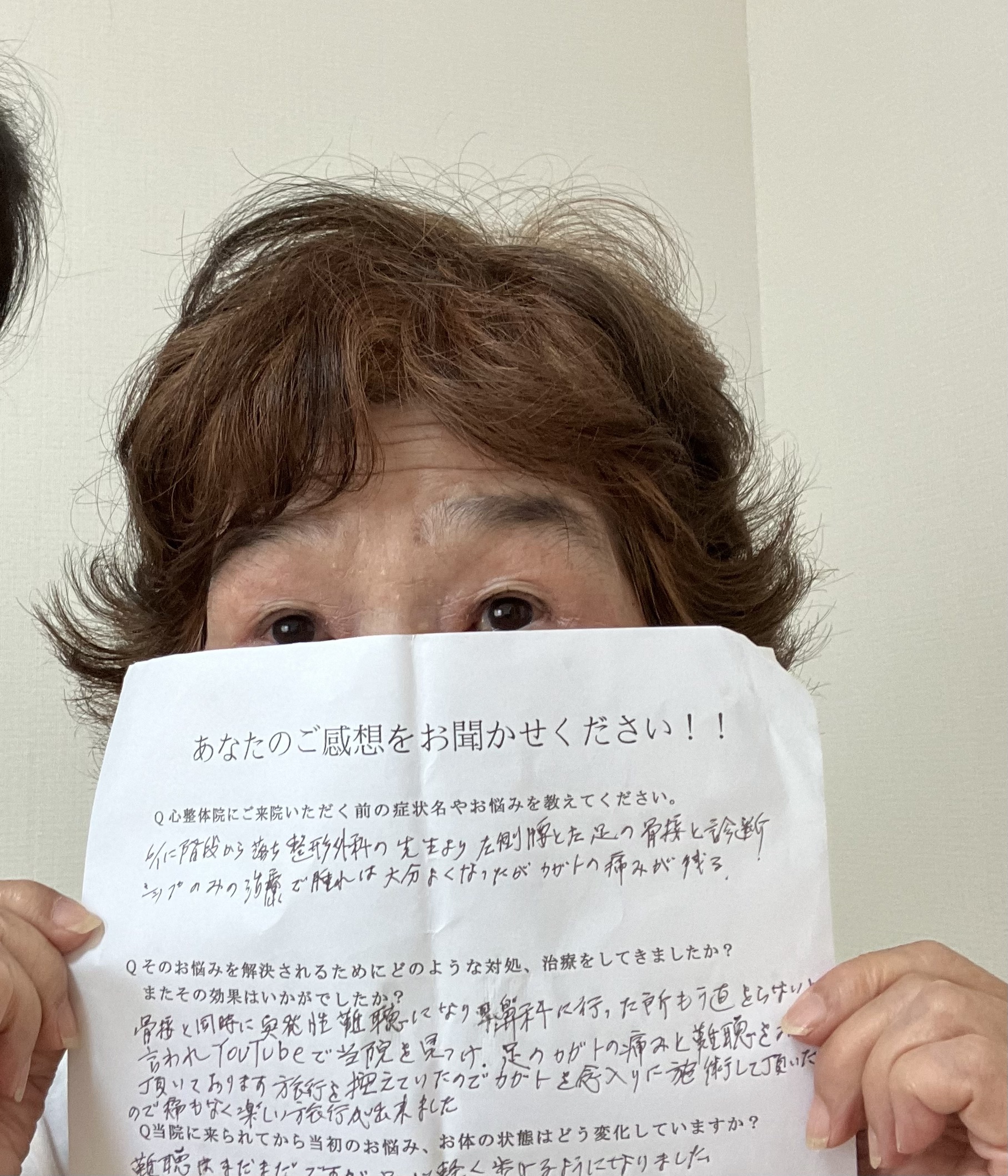 娘のご縁により、こちらの整体を受けると足がしっかりと上がるようになり、どんどん歩けるようになり、膝の痛みもなくなっていきました。痛みなく歩くことが出来て、とても嬉しいです。